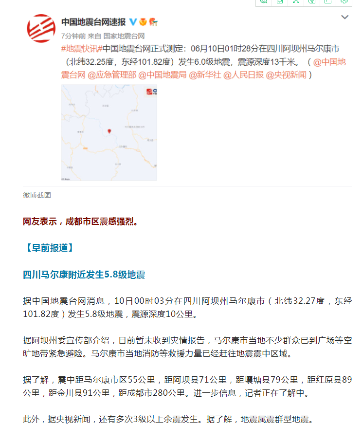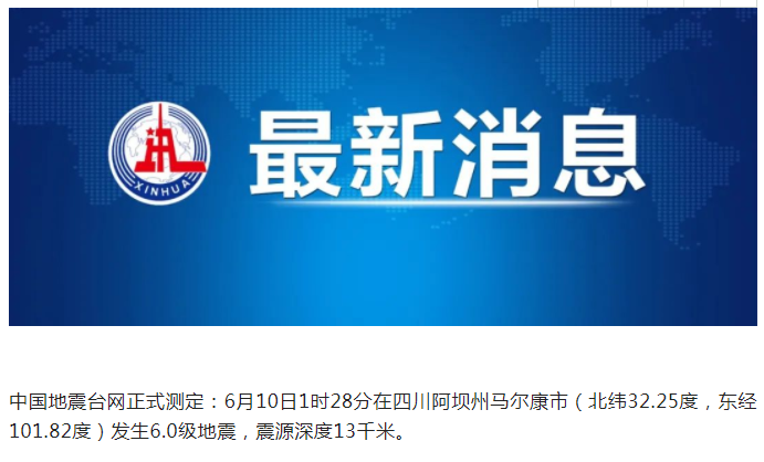 四川馬爾康附近發(fā)生多次地震,最高6.0級(jí)