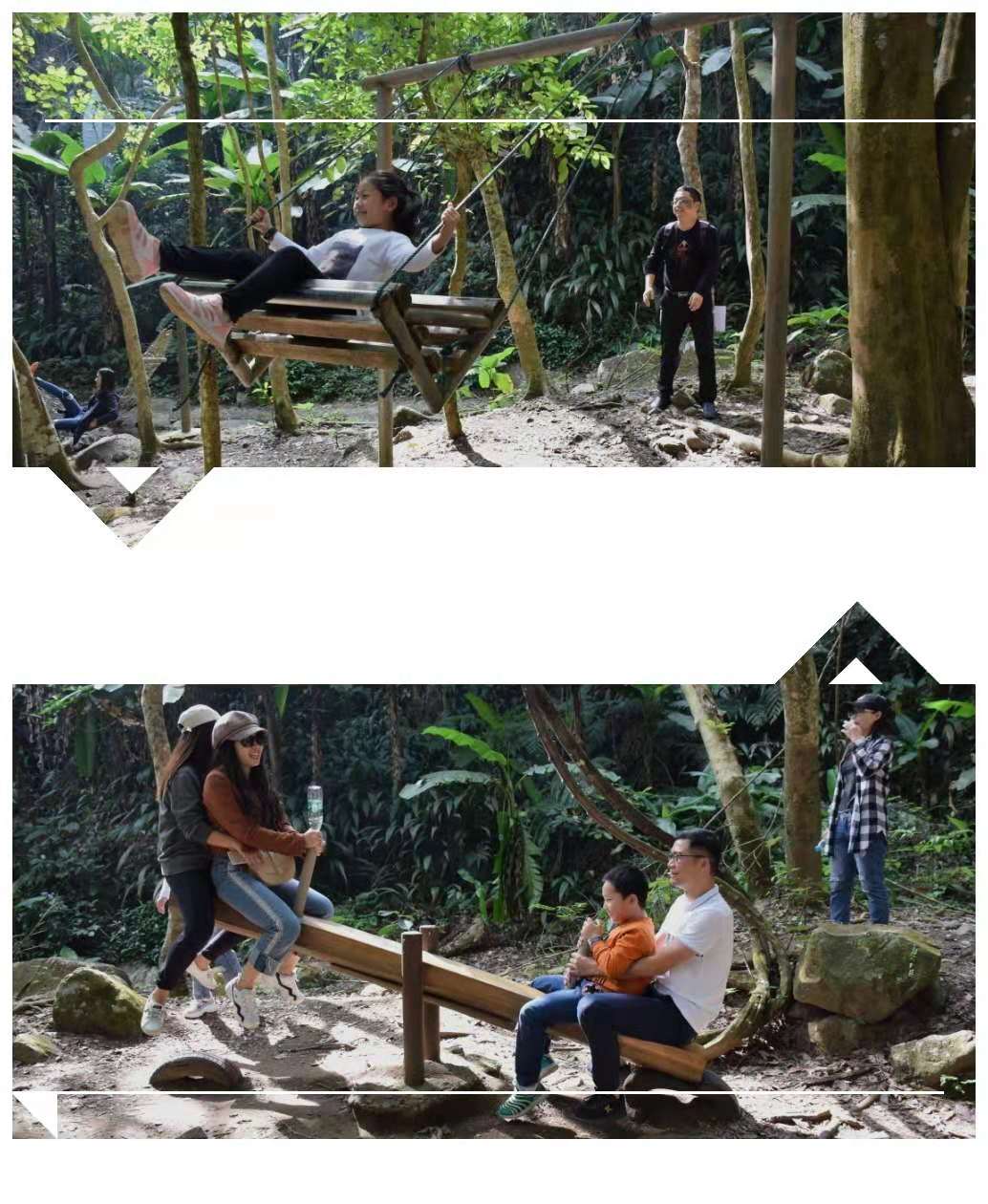 第一天是人工打造的風(fēng)景與樂園,而第二天則是原生態(tài)的景色與娛樂,大家與自然那么的親近?!耙叭稀保趼牽赡芾斫獠涣似涮N(yùn)意,但當(dāng)我們真正踏入其中,你就知道,它是相當(dāng)?shù)挠小耙叭ぁ绷?。里面有著各種娛樂設(shè)施,但又不同于游樂園里的,構(gòu)成簡單,大部分都是融入了這青翠山野中。許多是我們小時候玩過的游戲,它吸引著我們一個個參與其中。